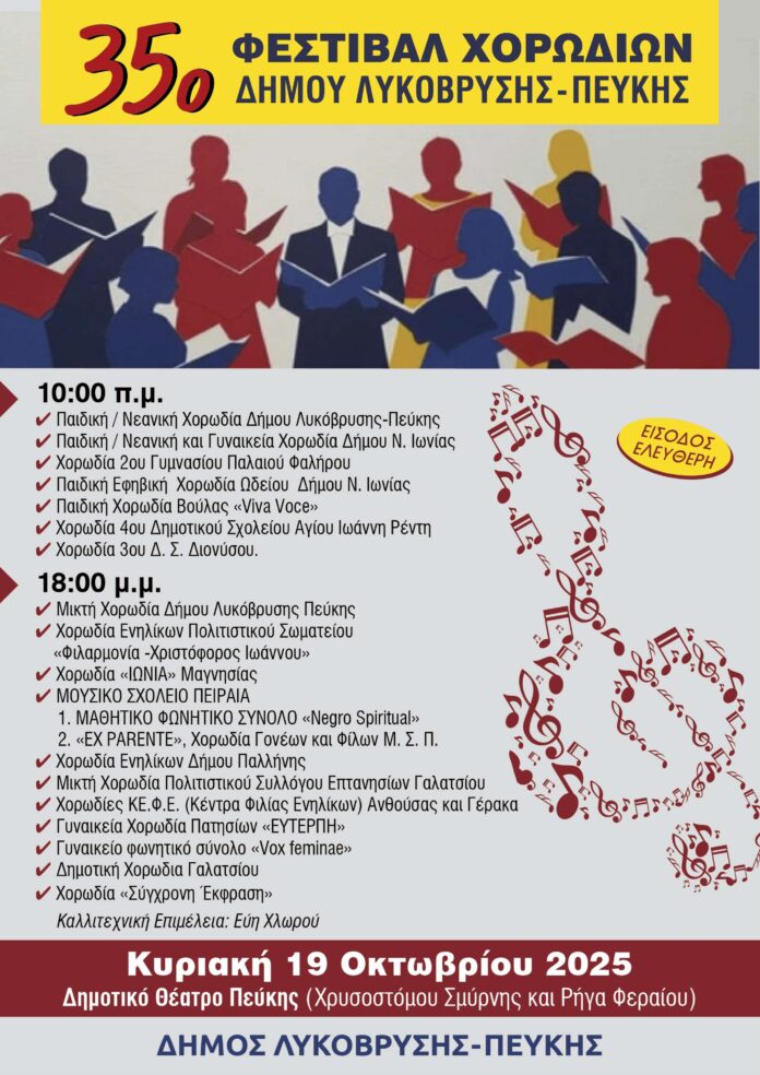 Την Κυριακή 19/10 & ώρα 10:00, ο Δήμος θα φιλοξενήσει, στο Δημοτικό Θέατρο Πεύκης και στα πλαίσια του 35ου Φεστιβάλ Χορωδιών, μια πλειάδα εκλεκτών χορωδιακών συνόλων, διαφόρων δήμων και Συλλόγων, που υπόσχονται να προσφέρουν στους παρευρισκόμενους όμορφες στιγμές μουσικής ανάτασης.