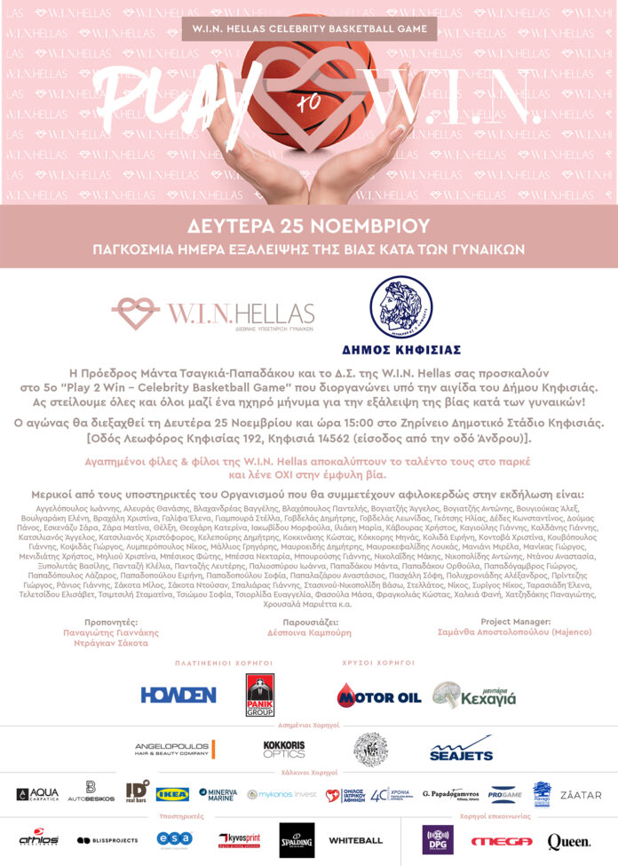 Η Πρόεδρος Μάντα Τσαγκιά-Παπαδάκου και το Δ.Σ. της WIN Hellas σας προσκαλούν στο 5ο “Play 2 Win – Celebrity Basketball Game” που διοργανώνει υπό την αιγίδα του Δήμου Κηφισιάς. Ας στείλουμε όλες και όλοι μαζί ένα ηχηρό μήνυμα για την εξάλειψη της βίας κατά των γυναικών!