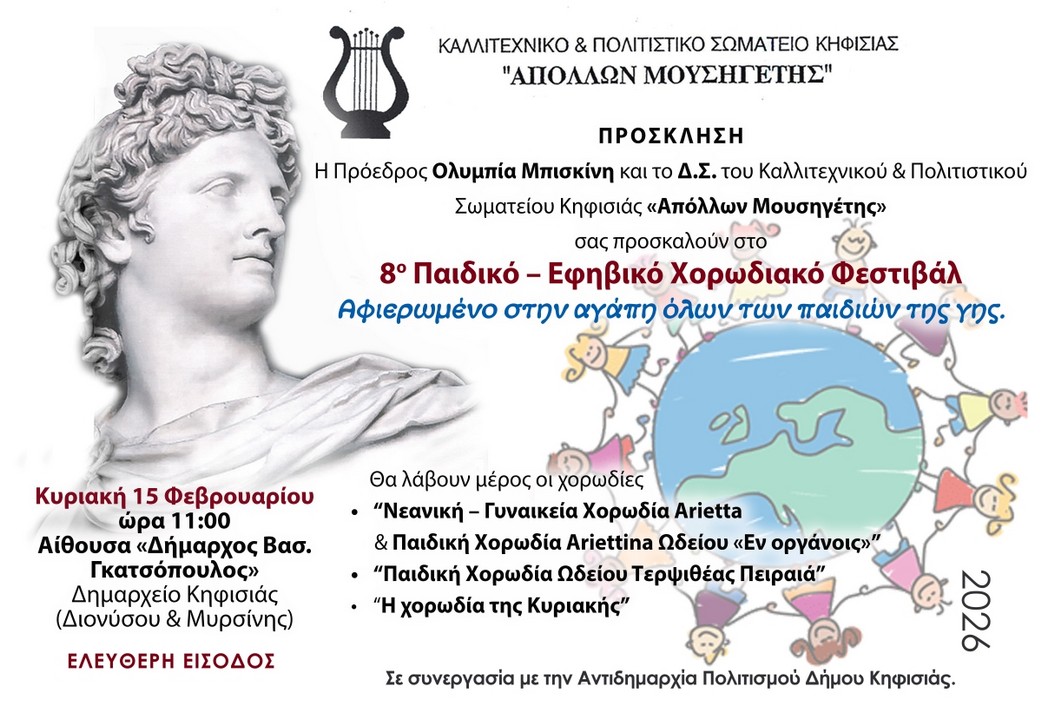 Η Πρόεδρος Ολυμπία Μπισκίνη και το Δ.Σ. του Καλλιτεχνικού & Πολιτιστικού Σωματείου Κηφισιάς «Απόλλων Μουσηγέτης» σας προσκαλούν στο 8ο Παιδικό – Εφηβικό Χορωδιακό Φεστιβάλ που θα πραγματοποιηθεί την
