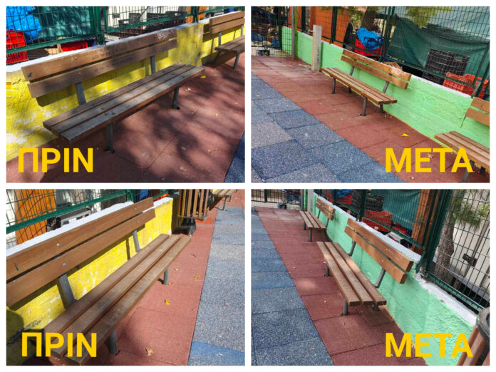 Συγκεκριμένα, πραγματοποιήθηκαν εργασίες βαφής στα παγκάκια, τα κάγκελα και τα τοιχία της παιδικής χαράς και τελικά παραδόθηκε ένα αποτέλεσμα αισθητά αναβαθμισμένο αισθητικά.