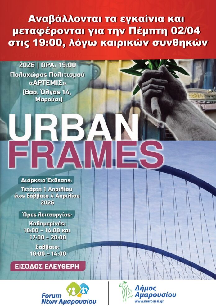 Ο Δήμος Αμαρουσίου και το Forum Νέων Δήμου Αμαρουσίου σας προσκαλούν στα εγκαίνια της ομαδικής έκθεσης φωτογραφίας «Urban Frames», την Τετάρτη 1 Απριλίου 2026 και ώρα 19:00, στον Πολυχώρο Πολιτισμού «Άρτεμις» (Βασ. Όλγας 14, Μαρούσι).