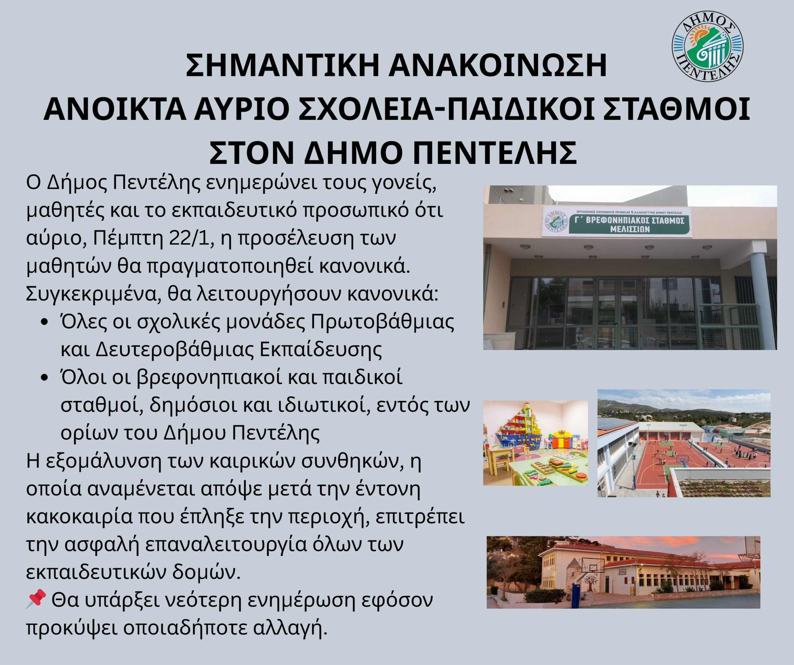 ΓΕΙΤΟΝΙΚΟΙ ΔΗΜΟΙΜΕΛΙΣΙΑ – ΠΕΝΤΕΛΗ Ανοιχτά 22/1 τα σχολεία και οι παιδικοί σταθμοί στον Δήμο Πεντέλης Από maroussi city - 22 Ιανουαρίου 2026 11 μερίδιο FacebookTwitterWhatsAppLinkedinEmailViber ΚΑΤΕΒΑΣΤΕ ΤΟ APP