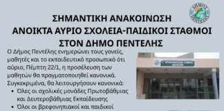 Ανοιχτά 22/1 τα σχολεία και οι παιδικοί σταθμοί στον Δήμο Πεντέλης