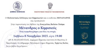Παρουσίαση βιβλίου της Ευαγγελίας Βαλάτα-Τσιάμα “Μένανδρος ο Κηφισιεύς”, 8/11 στο Δημαρχείο