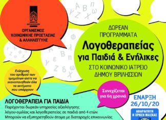 Συνεχίζεται για 5η χρονιά η Λογοθεραπεία παιδιών και ενηλίκων από τον Οργανισμό Κοινωνικής Προστασίας και Αλληλεγγύης,...