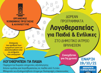 Για 5η συνεχόμενη χρονιά συνεχίζουμε τα ΔΩΡΕΑΝ ΠΡΟΓΡΑΜΜΑΤΑ ΛΟΓΟΘΕΡΑΠΕΙΑΣ στα Δημοτικά Ιατρεία...