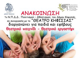 Το Ν.Π.Δ.Δ. Πολιτισμού & Αθλητισμού «Δημήτριος Βικέλας» του Δήμου Κηφισιάς, σε συνεργασία με το “ΘΕΑΤΡΟ ΚΗΦΙΣΙΑΣ” διοργανώνει θεατρικό εργαστήρι (Υποκριτική, ορθοφωνία, Κινησιολογία, αυτοσχεδιασμός) για...