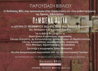 Το βιβλίο “Θαμμένα λόγια” της Έρικας Αθανασίου από τις εκδόσεις BELL, θα παρουσιαστεί στην έπαυλη Δροσίνη, Αγίων Θεοδώρων και Κυριακού.