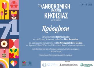 Ο Δήμαρχος Κηφισιάς, Βασίλης Ξυπολυτάς και η Αντιδήμαρχος Ανθοκομικής και Φιλοζωίας, Έλενα Χρονόπουλου σας προσκαλούν στα επίσημα εγκαίνια της 71ης Ανθοκομικής Έκθεσης Κηφισιάς, την...