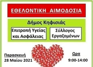 Η Επιτροπή Υγείας και Ασφάλειας Εργαζομένων και ο Σύλλογος Εργαζομένων του Δήμου Κηφισιάς, διοργανώνουν ΕΘΕΛΟΝΤΙΚΗ ΑΙΜΟΔΟΣΙΑ την Παρασκευή 28 Μαΐου 2021.