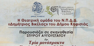 Η Θεατρική ομάδα του Ν.Π.Δ.Δ. «Δ. Βικέλας» του Δήμου Κηφισιάς παρουσιάζει σε σκηνοθεσία ΣΠΥΡΟΥ ΑΥΓΟΥΣΤΑΤΟΥ τρία μονόπρακτα της Σοφίας Μαυροειδή Παπαδάκημε άρωμα...