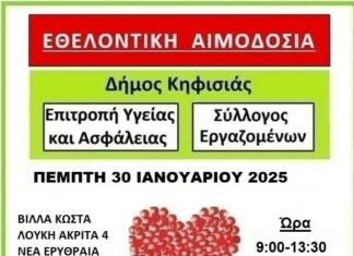 H Επιτροπή Υγείας και Ασφάλειας Εργαζομένων και ο Σύλλογος Εργαζομένων του Δήμου Κηφισιάς, διοργανώνουν ΕΘΕΛΟΝΤΙΚΗ ΑΙΜΟΔΟΣΙΑ την Πέμπτη 30 Ιανουαρίου 2025, από 9.00-13.30 στη...