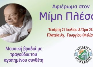 Μουσική βραδιά αφιερωμένη στον μουσικοσυνθέτη Μίμη Πλέσσα – Πλατεία Αγίου Γεωργίου (Μελίσσια), 21/7 –...