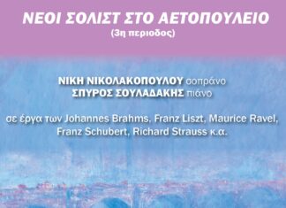 Με τη σοπράνο Νίκη Νικολακοπούλου και τον πιανίστα Σπύρο Σουλαδάκη ανοίγει ο 3ος κύκλος των συναυλιών «Νέοι σολίστ στο Αετοπούλειο», που διοργανώνουν η Συμφωνική...