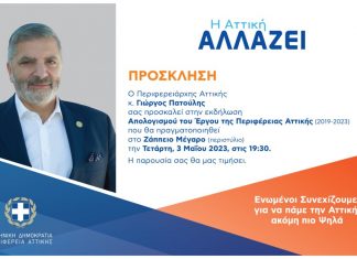 Στο Ζάππειο την Τετάρτη 3 Μαΐου 2023 στις 7:30 μ.μ. η εκδήλωση Απολογισμού του Έργου της Περιφέρειας Αττικής 2019-2023Παρουσία του Πρωθυπουργού Κυριάκου Μητσοτάκη, την...
