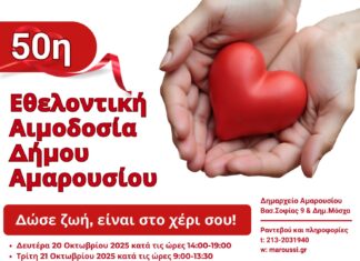 Επετειακή η 50η Εθελοντική Αιμοδοσία Δήμου Αμαρουσίου: Δευτέρα 20 – Τετάρτη 22 Οκτωβρίου 2025,...