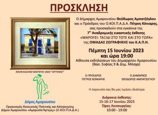Ο Δήμαρχος Αμαρουσίου Θεόδωρος Αμπατζόγλου και ο Πρόεδρος του ΟΚΟΙΠΑΔΑ Πέτρος Κόνιαρης σας προσκαλούν στα εγκαίνια της 7ης Αναδρομικής εικαστικής έκθεσης: «Μαρούσι: Ταξίδι Στο...