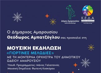 Ο Δήμαρχος Αμαρουσίου Θεόδωρος Αμπατζόγλου προσκαλεί μικρούς και μεγάλους να διασκεδάσουν και να παρακολουθήσουν τη Μουσική Εκδήλωση «Γιορτινές Μελωδίες» στην πλατεία Αγίας Λαύρας (Λεωφ. Κηφισίας 187, Μαρούσι) το Σάββατο, 17...