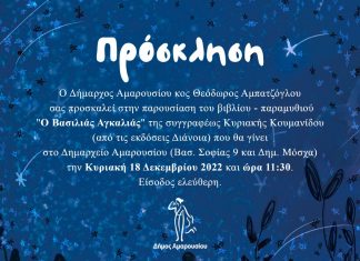 Ο Δήμαρχος Αμαρουσίου Θεόδωρος Αμπατζόγλου σας προσκαλεί στην παρουσίαση του βιβλίου-παραμυθιού «Ο Βασιλιάς Αγκαλιάς» της συγγραφέως Κυριακής Κουμανίδου (από τις εκδόσεις Διάνοια).Η παρουσίαση του...