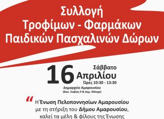 Συλλογή Τροφίμων – Φαρμάκων – Παιδικών Πασχαλινών Δώρων, 16 Απριλίου, 10:30 – 13:30,...