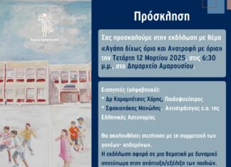 Σας προσκαλούμε στην εκδήλωση με θέμα «Αγάπη δίχως όρια και Ανατροφή με όρια»την Τετάρτη 12 Μαρτίου 2025, στις 6:30 μ.μ., στο Δημαρχείο Αμαρουσίου.Εισηγητές (αλφαβητικά):* Δρ Καραμπέτσος Χάρης, Παιδοψυχίατρος* Σφακιανάκης Μανώλης, Αντιστράτηγος...