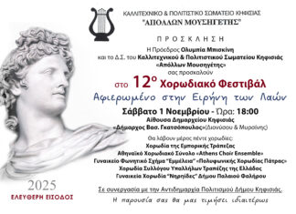 Η Πρόεδρος Ολυμπία Μπισκίνη και το Δ.Σ. του Καλλιτεχνικού & Πολιτιστικού Σωματείου Κηφισιάς «Απόλλων Μουσηγέτης» σας προσκαλούν στο 12ο Χορωδιακό Φεστιβάλ που θα πραγματοποιηθεί το Σάββατο 1 Νοεμβρίου 2025,...