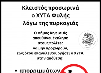 Λόγω της απόφασης του ΕΔΣΝΑ να κλείσει προσωρινά ο ΧΥΤΑ Φυλής, εξαιτίας της πυρκαγιάς που ξέσπασε σήμερα το μεσημέρι (22/8), ο Δήμος Κηφισιάς απευθύνει...