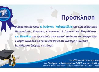 Η Τελετή Βράβευσης των επιτυχόντων μαθητών του Δήμου Διονύσου στην Τριτοβάθμια Εκπαίδευση, την Τετάρτη 4/1 στο Πολιτιστικό Κέντρο Αγίου Στεφάνου
