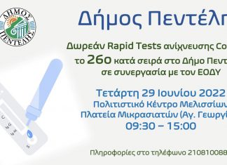 Τεστ ανίχνευσης Covid-19, το 26ο κατά σειρά στο Δήμο Πεντέλης – Τετάρτη 29 Ιουνίου...