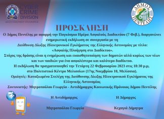 Ο Δήμος Πεντέλης με αφορμή την Παγκόσμια Ημέρα Ασφαλούς Διαδικτύου 7 Φεβρουαρίου διοργανώνει Ενημερωτική Εκδήλωση σε συνεργασία με τη Διεύθυνση Δίωξης Ηλεκτρονικού Εγκλήματος της...
