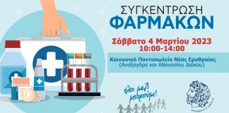 Ο Δήμος Κηφισιάς σε συνεργασία με το «Όλοι Μαζί Μπορούμε» διοργανώνει δράση συγκέντρωσης φαρμάκων και υγειονομικού υλικού για την ενίσχυση του Κοινωνικού μας Φαρμακείου, το Σάββατο 4 Μαρτίου 2023, ώρες 10.00–14.00 στο Κοινωνικό Παντοπωλείο Νέας...