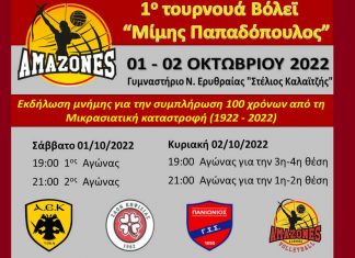 Οι Αμαζόνες υποδέχονται την ΑΕΚ, τον Πανιώνιο και τον ΖΑΟΝ στο 1ο Τουρνουά Βόλεϊ «Μίμης Παπαδόπουλος» στις 1-2 Οκτωβρίου, στο Γυμναστήριο Ν. Ερυθραίας «Στέλιος...
