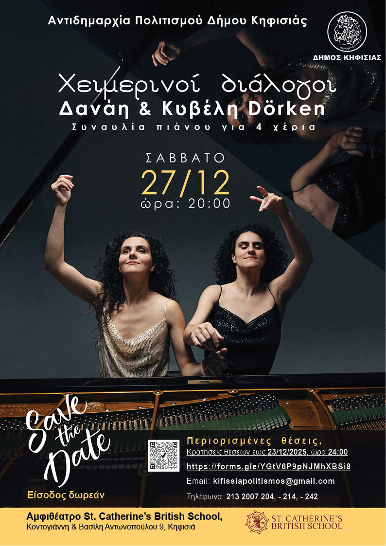 Η Δανάη και η Κυβέλη Dörken, Καλλιτεχνικές Διευθύντριες του Διεθνούς Φεστιβάλ Μουσικής Μολύβου και πιανίστριες με διεθνή αναγνώριση, παρουσιάζουν μια μοναδική συναυλία στις 27 Δεκεμβρίου 2025, στο ολοκαίνουργιο αμφιθέατρο του St. Catherine’s British School, με ελεύθερη είσοδο.