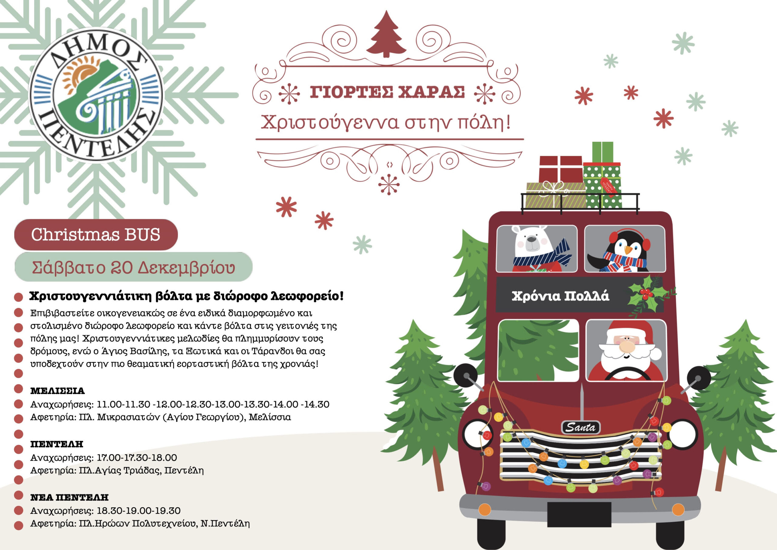 ΓΕΙΤΟΝΙΚΟΙ ΔΗΜΟΙΜΕΛΙΣΙΑ – ΠΕΝΤΕΛΗ CHRISTMAS BUS- Χριστουγεννιάτικη βόλτα για μικρούς και μεγάλους με διώροφο λεωφορείο – Σάββατο 20/12 Από maroussi city - 19 Δεκεμβρίου 2025 3 μερίδιο FacebookTwitterWhatsAppLinkedinEmailViber ΚΑΤΕΒΑΣΤΕ ΤΟ APP