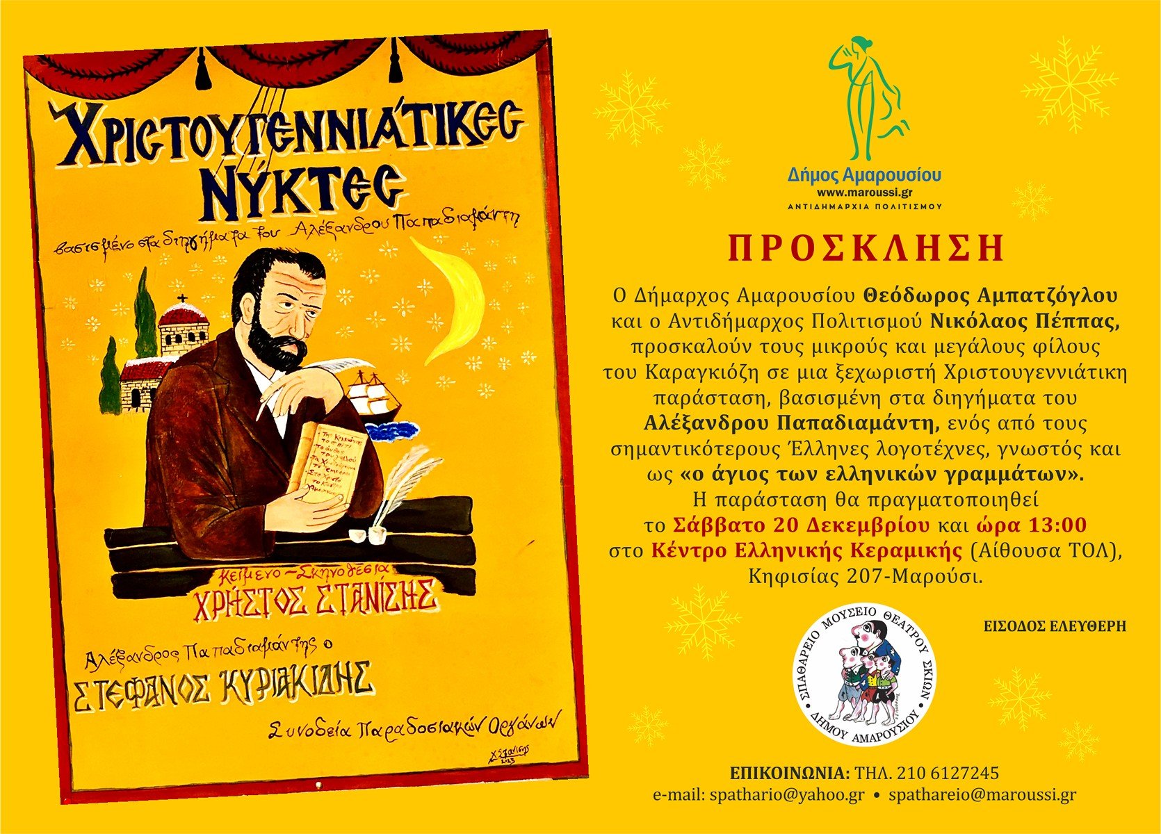 Ο Δήμαρχος Αμαρουσίου Θεόδωρος Αμπατζόγλου και ο Αντιδήμαρχος Πολιτισμού Νικόλαος Πέππας, προσκαλούν τους μικρούς και μεγάλους φίλους του Καραγκιόζη σε μια ξεχωριστή Χριστουγεννιάτικη παράσταση, βασισμένη στα διηγήματα του Αλέξανδρου Παπαδιαμάντη, ενός από τους σημαντικότερους Έλληνες λογοτέχνες, γνωστός και ως «ο άγιος των ελληνικών γραμμάτων».