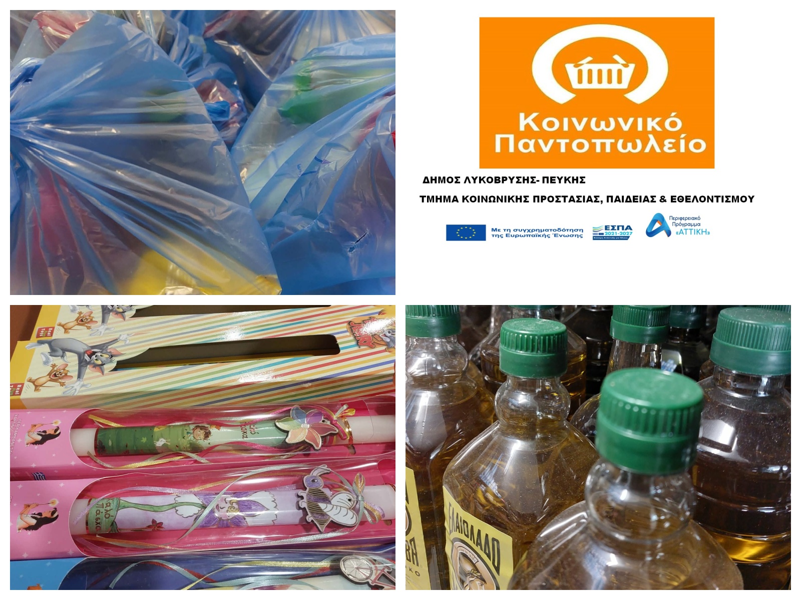 Πραγματοποιήθηκε, στις 6 Απριλίου, από το Κοινωνικό Παντοπωλείο του Δήμου Λυκόβρυσης-Πεύκης η διανομή προϊόντων για τον μήνα Απρίλιο, στην οποία εξυπηρετήθηκαν συνολικά 94 οικογένειες, στα εξής προϊόντα: ζάχαρη, αλεύρι, ντοματοχυμό, όσπρια, ρύζι, ζυμαρικά, ψωμί του τοστ, ελαιόλαδο, αραβοσιτέλαιο, κάψουλες πλυντηρίου, αλάτι, μαρμελάδα, ξύδι, καθαριστικά, χαρτί υγείας, χαρτοπετσέτες, μπισκότα, χυμούς, πάνες βρεφικές, βρεφικό γάλα και κρέμες, μωρομάντηλα και υποσέντονα. Δόθηκαν επίσης τσουρέκια και λαμπάδες, εν όψει του Πάσχα.