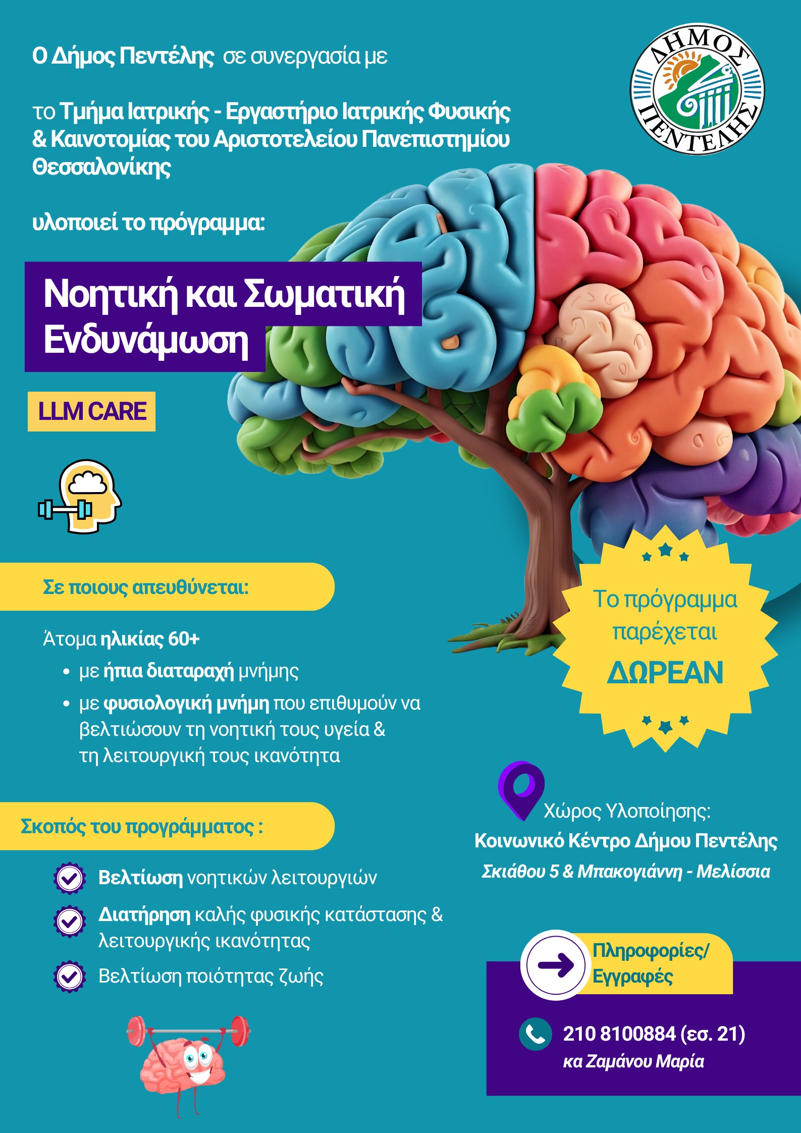 Ο Δήμος Πεντέλης θέτοντας σε προτεραιότητα την πρόληψη και την ορθή αντιμετώπιση προβλημάτων σωματικής και ψυχικής υγείας, ιδιαίτερα των μεγαλύτερης ηλικίας πολιτών του, υλοποιεί το Πρόγραμμα νοητικής και σωματικής ενδυνάμωσης (LLM CARE) σε συνεργασία με το Αριστοτέλειο Πανεπιστήμιο Θεσσαλονίκης, Τμήμα Ιατρικής- Εργαστήριο Ιατρικής φυσικής και ψηφιακής καινοτομίας.