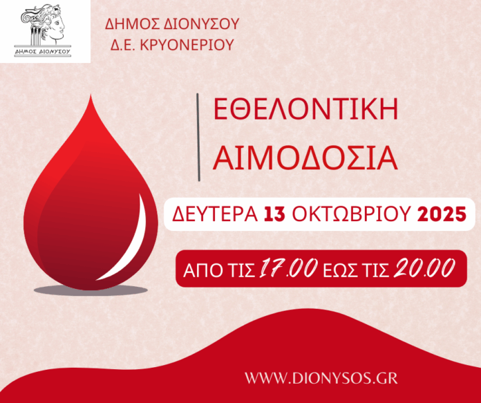 ΔΗΜΟΣ ΔΙΟΝΥΣΟΥ Δώσε ζωή, γίνε εθελοντής αιμοδότης Από maroussi city - 30 Οκτωβρίου 2025 5 μερίδιο FacebookTwitterWhatsAppLinkedinEmailViber Ο Δήμος Διονύσου – Δ.Ε. Κρυονερίου σας καλεί να συμμετάσχετε στην Εθελοντική Αιμοδοσία: 📅 Δευτέρα 13 Οκτωβρίου 2025⏰ Από 17:00 έως 20:00Με μία μόνο πράξη, μπορείς να σώσεις ζωές! ΚΑΤΕΒΑΣΤΕ ΤΟ APP