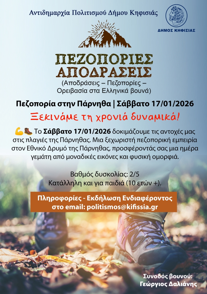 Οι πεζοπορίες και αποδράσεις που σχεδίασε και ενέταξε η Αντιδημαρχία Πολιτισμού του Δήμου Κηφισιάς στο πρόγραμμα Μαθημάτων Καλλιτεχνικής Παιδείας για ενήλικες και παιδιά 2025 – 2026 συνεχίζονται δυναμικά και τη νέα χρονιά!