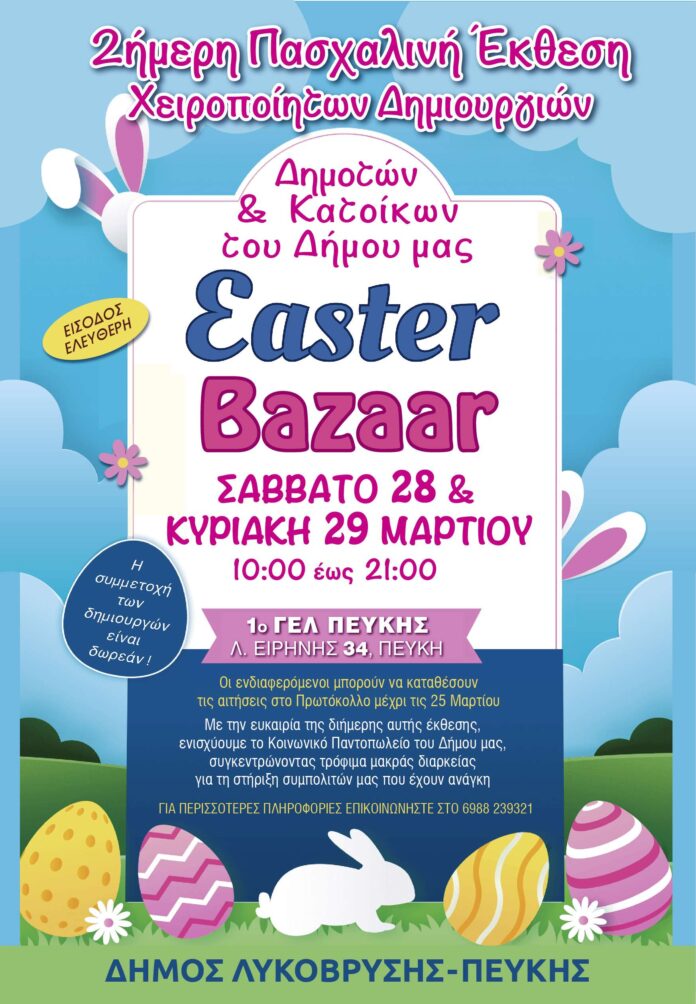 Το Σάββατο 28 και την Κυριακή 29 Μαρτίου 2026, από ώρα 10:00 έως 21:00, ο Δήμος Λυκόβρυσης-Πεύκης προσκαλεί τους δημότες στην Πασχαλινή Έκθεση Χειροποίητων Δημιουργιών, στην αίθουσα εκδηλώσεων του 1ου Λυκείου Πεύκης (Λ. Ειρήνης 34, Πεύκη).