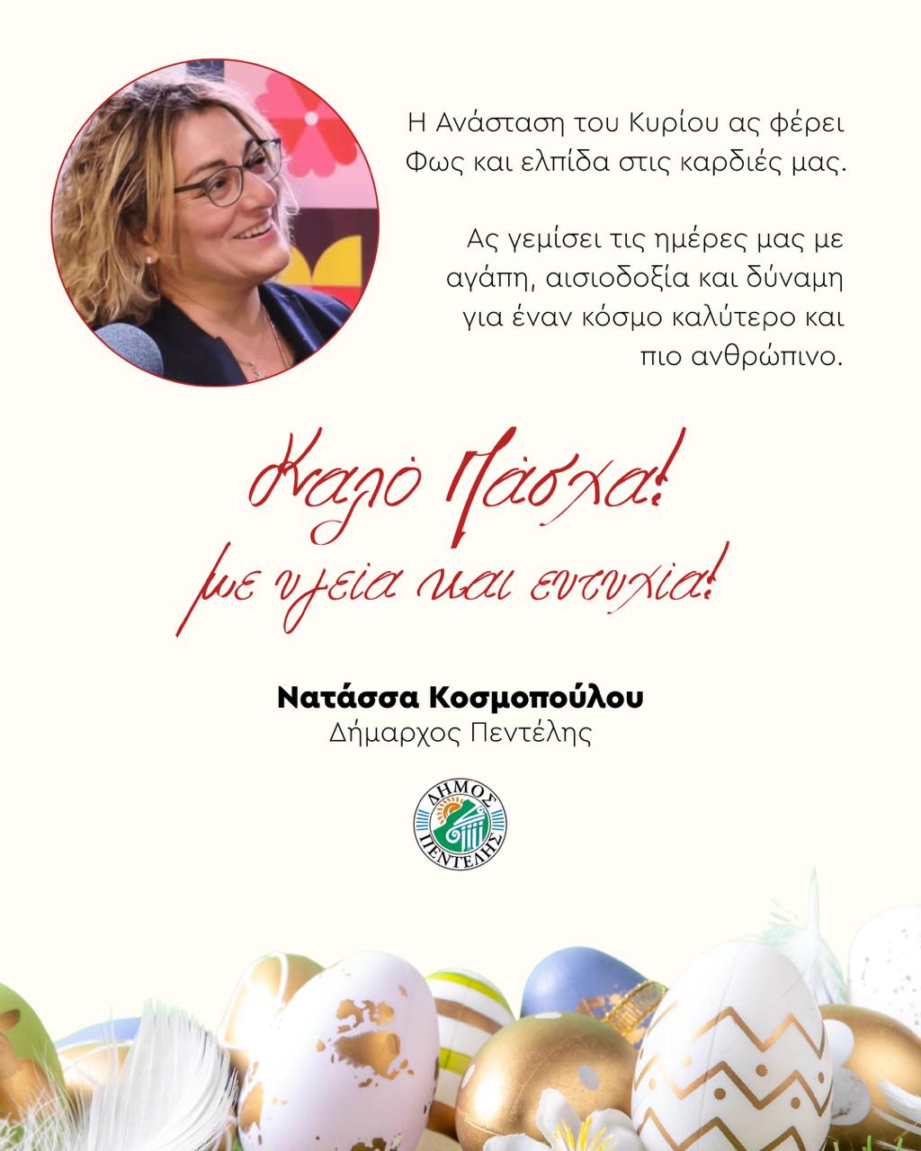 ΓΕΙΤΟΝΙΚΟΙ ΔΗΜΟΙΜΕΛΙΣΙΑ – ΠΕΝΤΕΛΗΕυχές της Δημάρχου Νατάσσας Κοσμοπούλου για Καλή Ανάσταση και Καλό Πάσχα!Από maroussi city - 9 Απριλίου 20260μερίδιοFacebookXWhatsAppLinkedinEmailViber ΚΑΤΕΒΑΣΤΕ ΤΟ APP
