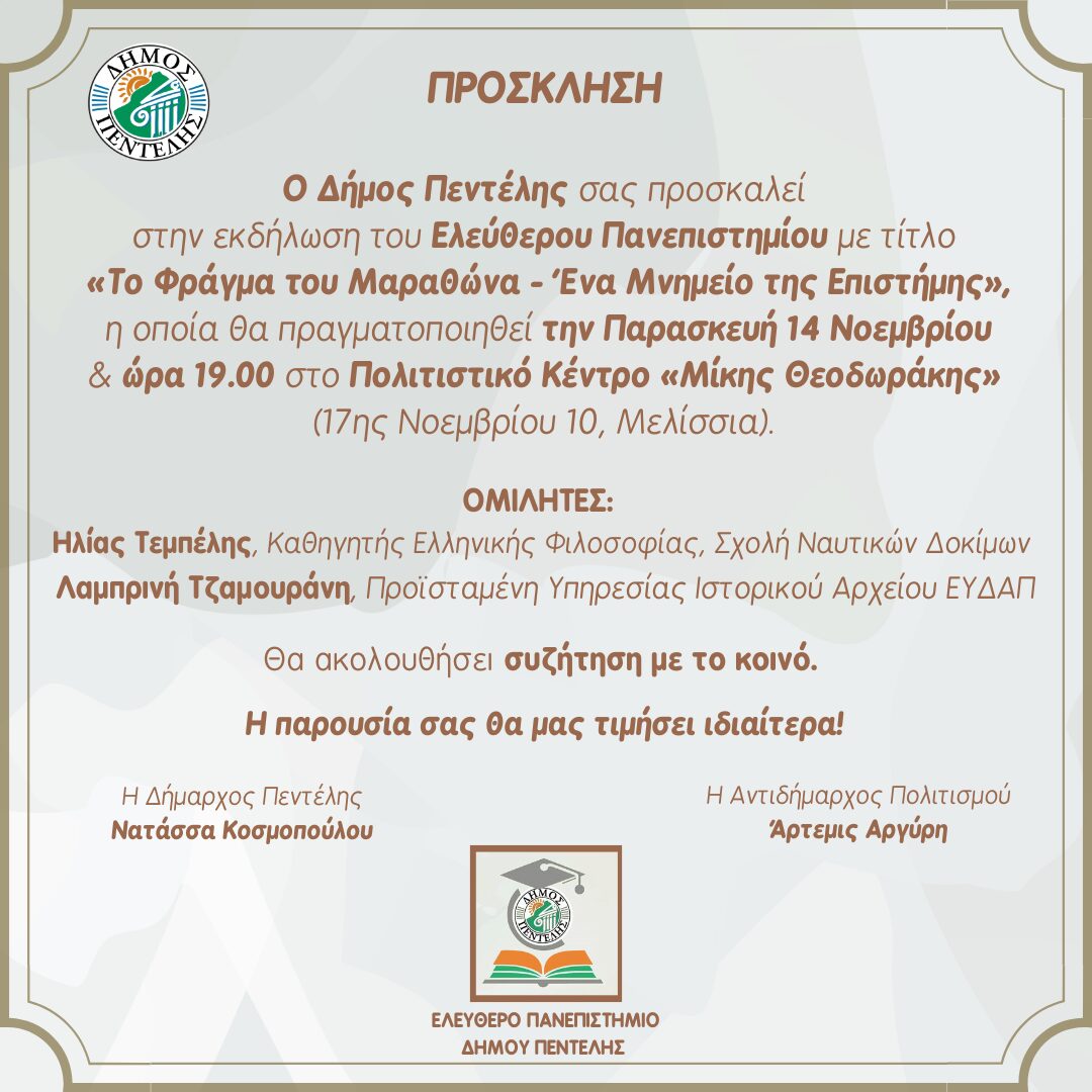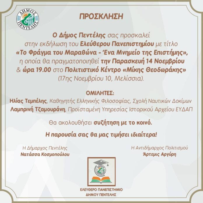 ΓΕΙΤΟΝΙΚΟΙ ΔΗΜΟΙΜΕΛΙΣΙΑ – ΠΕΝΤΕΛΗ Εκδήλωση Ελεύθερου Πανεπιστημίου Δήμου Πεντέλης με τίτλο: ‘To Φράγμα του Μαραθώνα – ένα Μνημείο της Επιστήμης’ Από maroussi city - 11 Νοεμβρίου 2025 4 μερίδιο FacebookTwitterWhatsAppLinkedinEmailViber ΚΑΤΕΒΑΣΤΕ ΤΟ APP