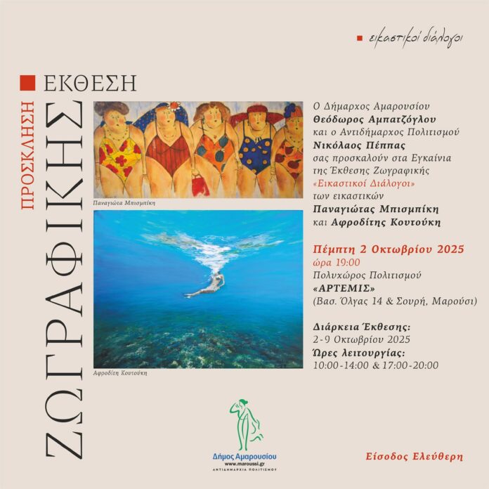 Ο Δήμαρχος Αμαρουσίου Θεόδωρος Αμπατζόγλου και ο Αντιδήμαρχος Πολιτισμού Νικόλαος Πέππας σας προσκαλούν στα Εγκαίνια της Έκθεσης Ζωγραφικής «Εικαστικοί Διάλογοι», των εικαστικών Παναγιώτας Μπισμπίκη και Αφροδίτης Κουτούκη, την Πέμπτη 2 Οκτωβρίου 2025 και ώρα 19:00 στον Πολυχώρο Πολιτισμού «ΑΡΤΕΜΙΣ» (Βασ. Όλγας 14 & Σουρή, Μαρούσι).