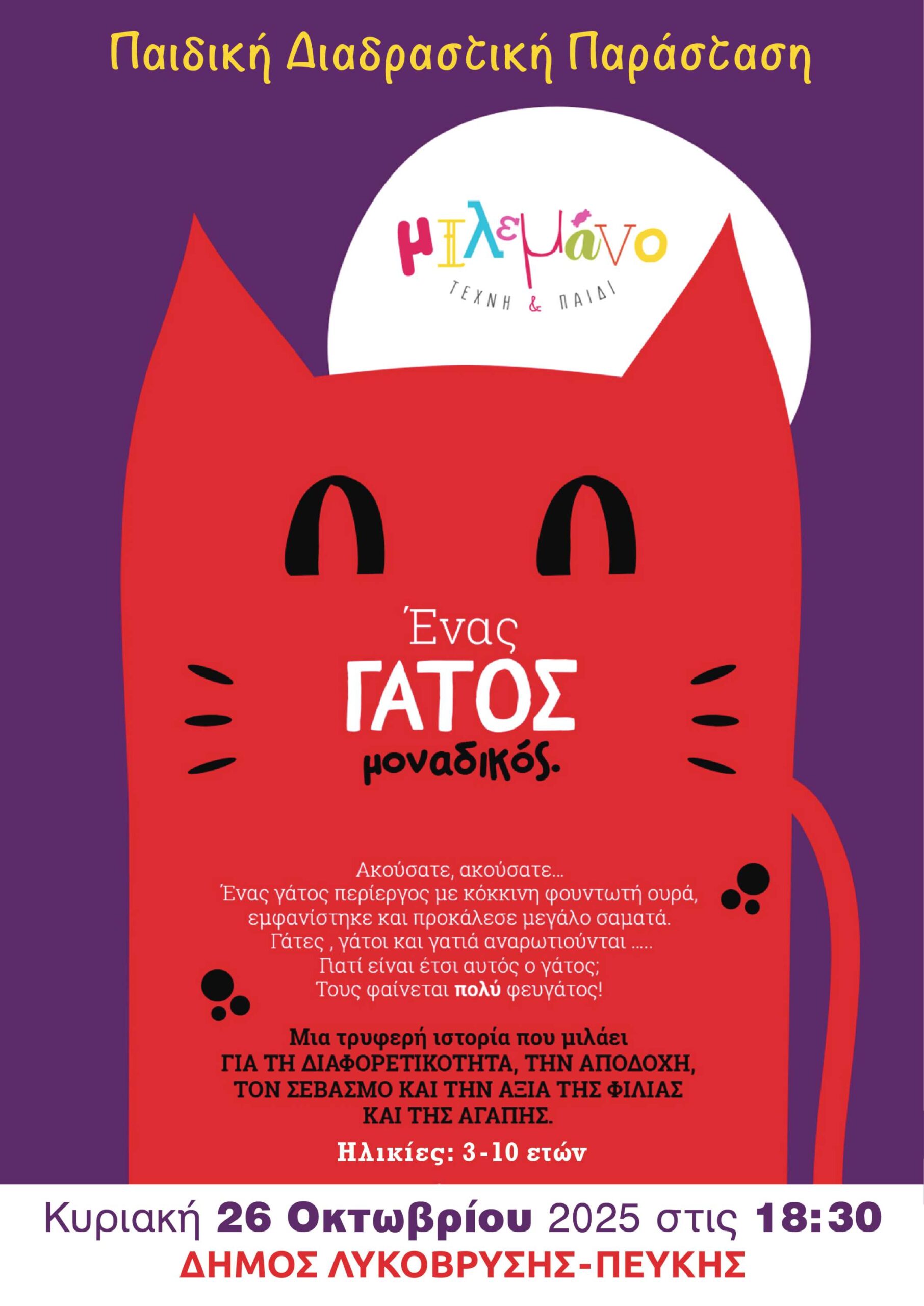 Την Κυριακή 26 Οκτωβρίου & ώρα 18:30, ο Δήμος Λυκόβρυσης-Πεύκης, σε συνεργασία με το «Μιλεμάνο» ΤΕΧΝΗ & ΠΑΙΔΙ, θα παρουσιάσει στο Δημοτικό Θέατρο Πεύκης μια τρυφερή ιστορία που μιλάει για τη Διαφορετικότητα, την Αποδοχή, τον Σεβασμό και την αξία της Φιλίας και της Αγάπης, τη Παιδική Διαδραστική Παράσταση με τίτλο: «Ένας γάτος μοναδικός».