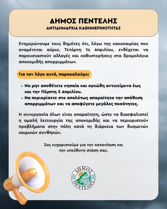 Η Αντιδημαρχία Καθημερινότητας του Δήμου Πεντέλης ενημερώνει τους δημότες ότι, λόγω της κακοκαιρίας που αναμένεται την Τετάρτη 1 Απριλίου ενδέχεται να παρουσιαστούν αλλαγές και καθυστερήσεις στα δρομολόγια αποκομιδής των απορριμμάτων.