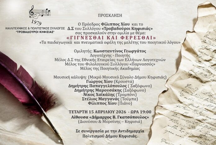 Ο Πρόεδρος Φίλιππος Χίου και το Δ.Σ. του Συλλόγου «Τροβαδούροι Κηφισιάς» σας προσκαλούν στην ομιλία με θέμα: «ΓΙΓΝΕΣΘΑΙ ΚΑΙ ΦΕΡΕΣΘΑΙ» «Τα παιδαγωγικά και πνευματικά οφέλη της μελέτης του ποιητικού λόγου», που θα πργματοποιηθεί σε συνεργασία με την Αντιδημαρχία Πολιτισμού Δήμου Κηφισιάς, την Τετάρτη 15 Απριλίου, στις 19.00, στην Αίθουσα «Δήμαρχος Β. Γκατσόπουλος» του Δημαρχείου Κηφισιάς (Διονύσου & Μυρσίνης 2).