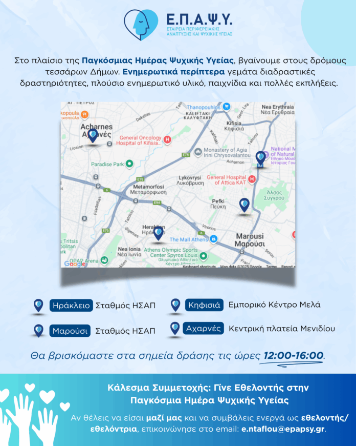 Η Ε.Π.Α.Ψ.Υ. γιορτάζει την Παγκόσμια Ημέρα Ψυχικής Υγείας (10/10) με μια μοναδική δράση στην Κηφισιά