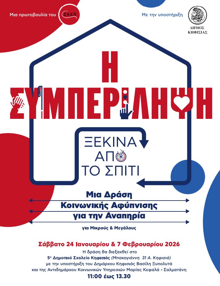 Το πιλοτικό πρόγραμμα του Συνδέσμου Κοινωνικής Ευθύνης για Παιδιά και Νέους (Σ.Κ.Ε.Π.), σε συνεργασία με τον Δήμο Κηφισιάς, σας προσκαλεί το Σάββατο 24 Ιανουαρίου & 7/2, στο 5ο Δημοτικό Σχολείο Κηφισιάς (Μπακογιάννη 31Α – Κηφισιά) στις 11.00 π.μ. σε ένα διαδραστικό ταξίδι κοινωνικής αφύπνισης για την αναπηρία — με στόχο να μπορούμε, ως γονείς και εκπαιδευτικοί, να καλλιεργήσουμε τη συμπερίληψη από τα πρώτα χρόνια ζωής.