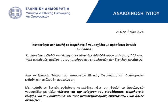 Από το Γραφείο Τύπου του Υπουργείου Εθνικής Οικονομίας και Οικονομικών