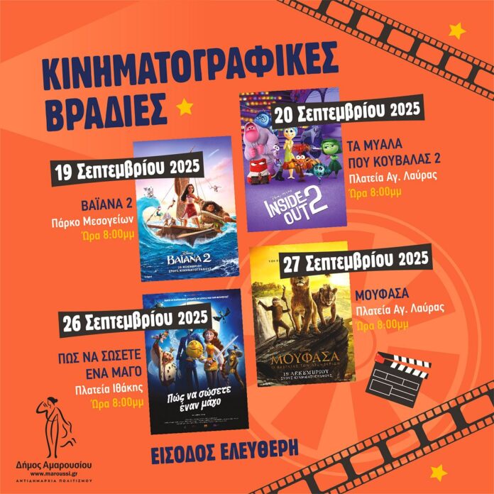 Η ΠΟΛΗ ΜΑΣΔΗΜΟΤΙΚΗ ΑΡΧΗΜΑΡΟΥΣΙ Κινηματογραφικές βραδιές, Παρασκευή 26 Σεπτεμβρίου: ΠΩΣ ΝΑ ΣΩΣΕΤΕ ΕΝΑ ΜΑΓΟ | Σάββατο 27 Σεπτεμβρίου: ΜΟΥΦΑΣΑ Από maroussi city - 1 Οκτωβρίου 2025 11 μερίδιο FacebookTwitterWhatsAppLinkedinEmailViber Και στις δύο βραδιές, με ελεύθερη είσοδο , οι οικογένειες είχαν την ευκαιρία να ζήσουν τη μαγεία του κινηματογράφου σε ανοιχτούς χώρους της πόλης, σε μια ζεστή ατμόσφαιρα που ενίσχυσε το αίσθημα κοινότητας και συμμετοχής. ΚΑΤΕΒΑΣΤΕ ΤΟ APP